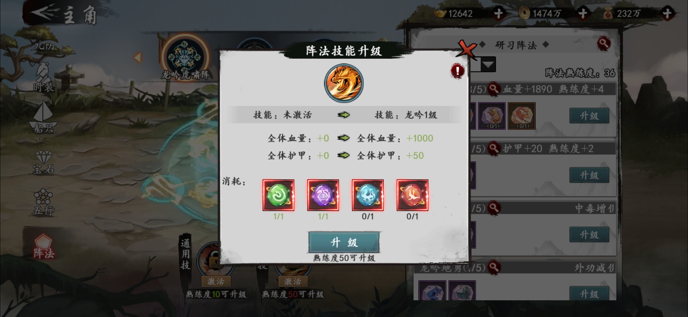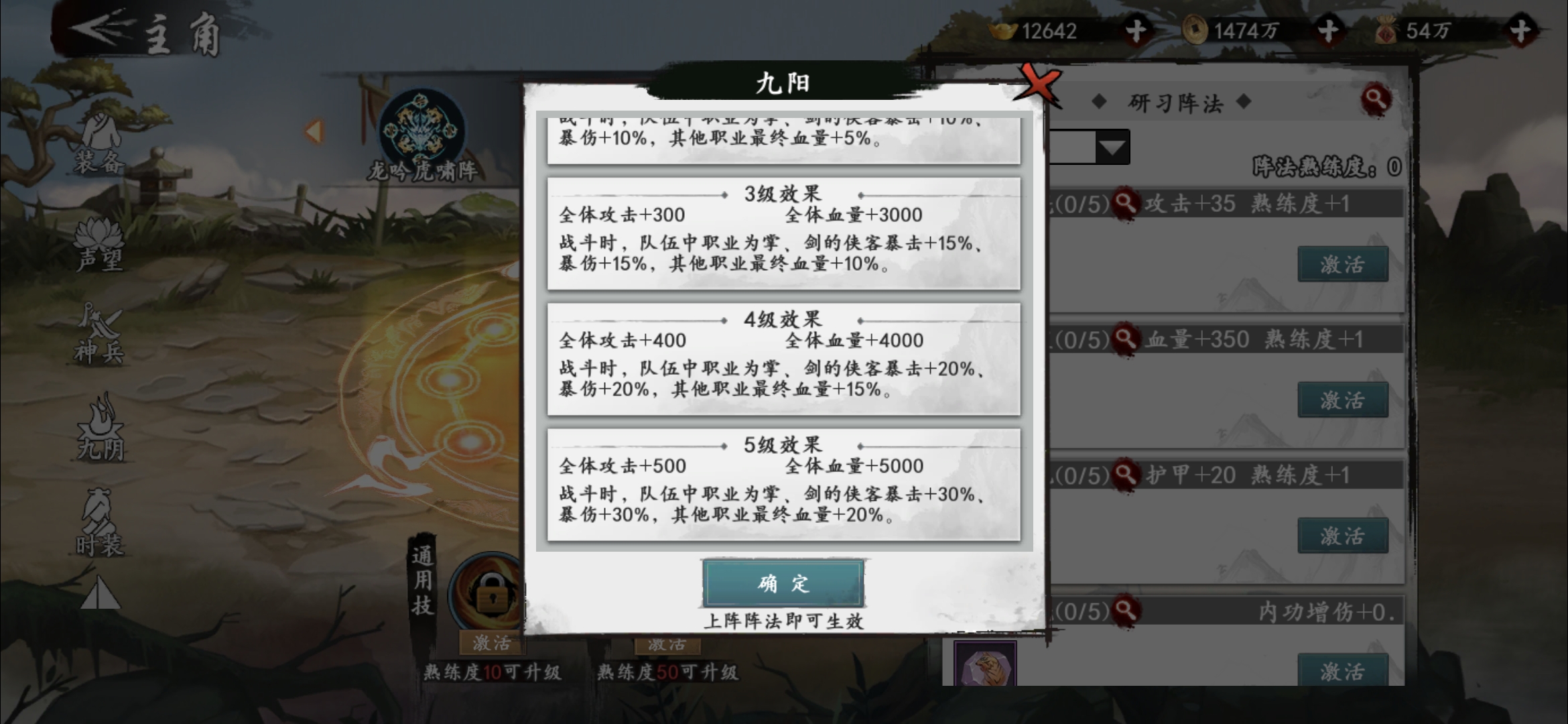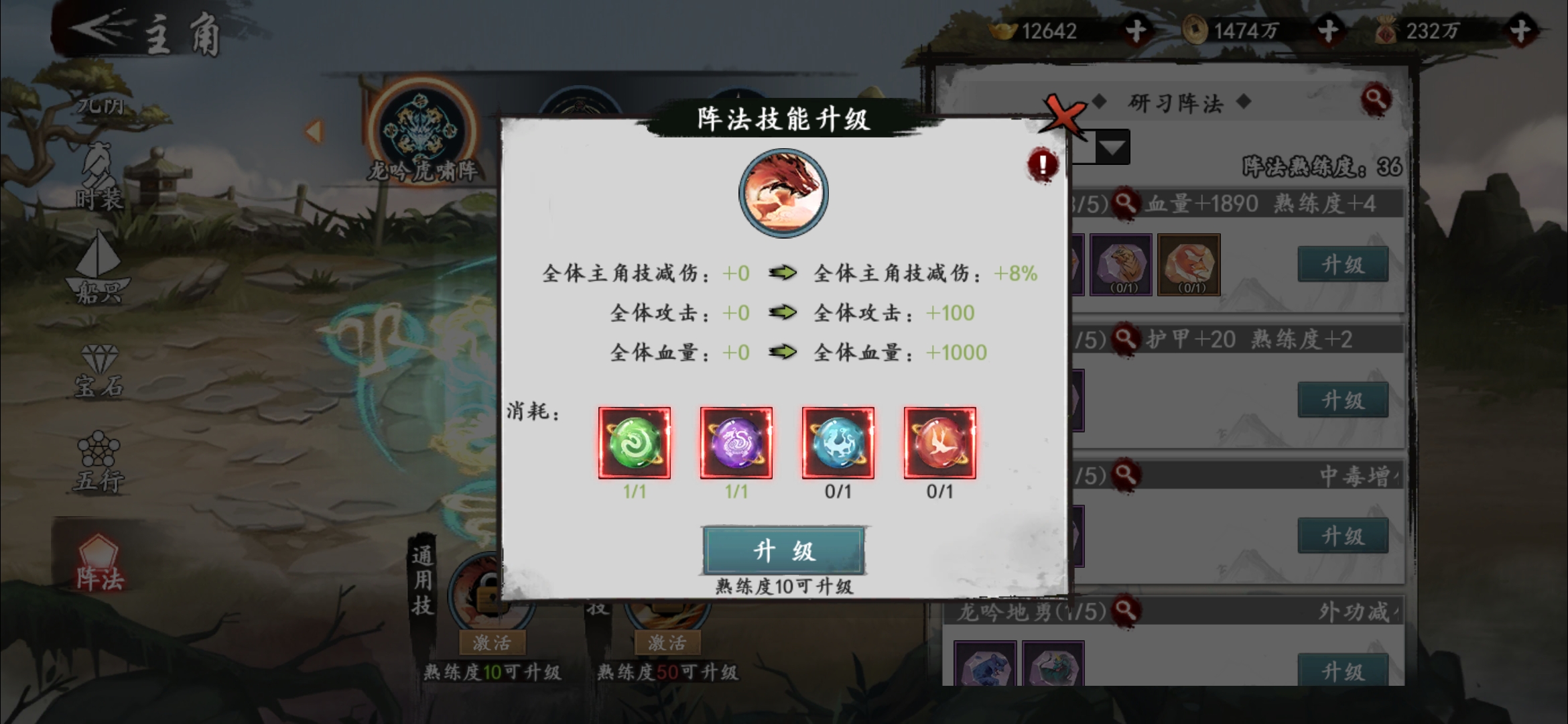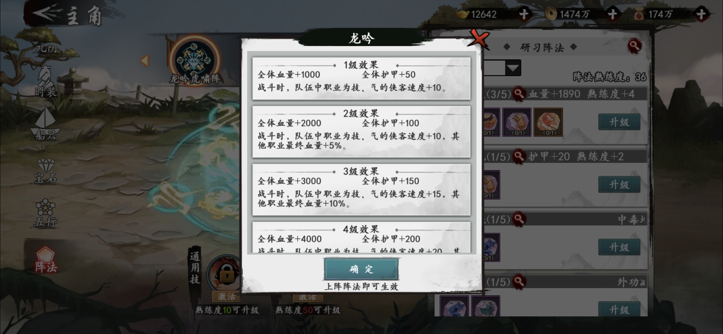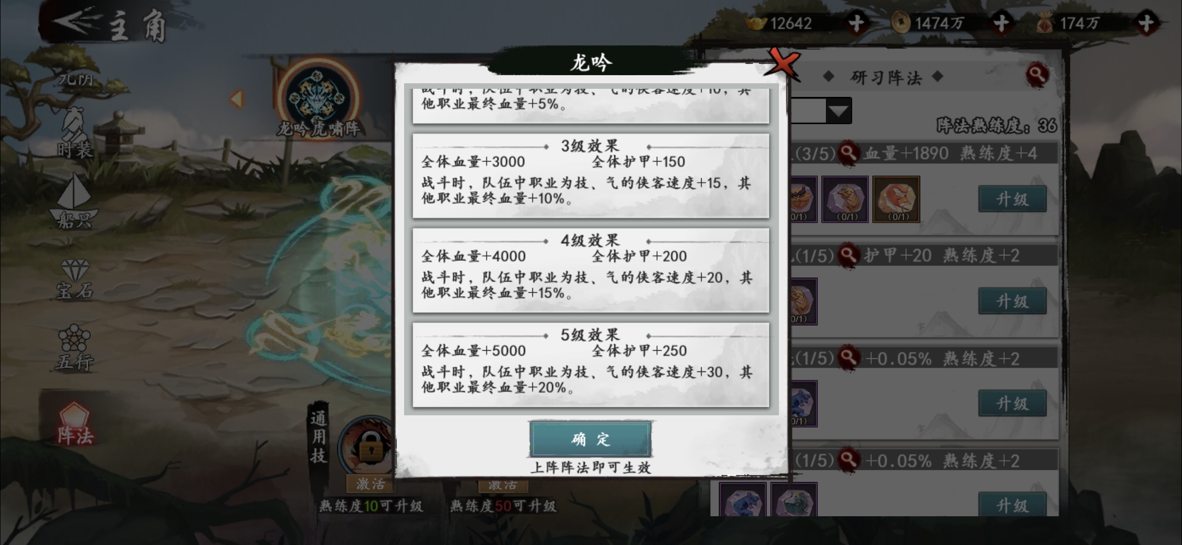 在讲解主题之前,我先讲一下阵法。目前阵法有三,一共分为虎啸龙吟阵、五行八卦阵、九阳无极阵,每个阵法分为2个“小阶段”,拿虎啸龙吟阵法来说,第一步为激活通用技“虎啸”,第二步为激活阵法技“龙吟”,当然,每一步还需要升级5次,不同级别对应不同属性。