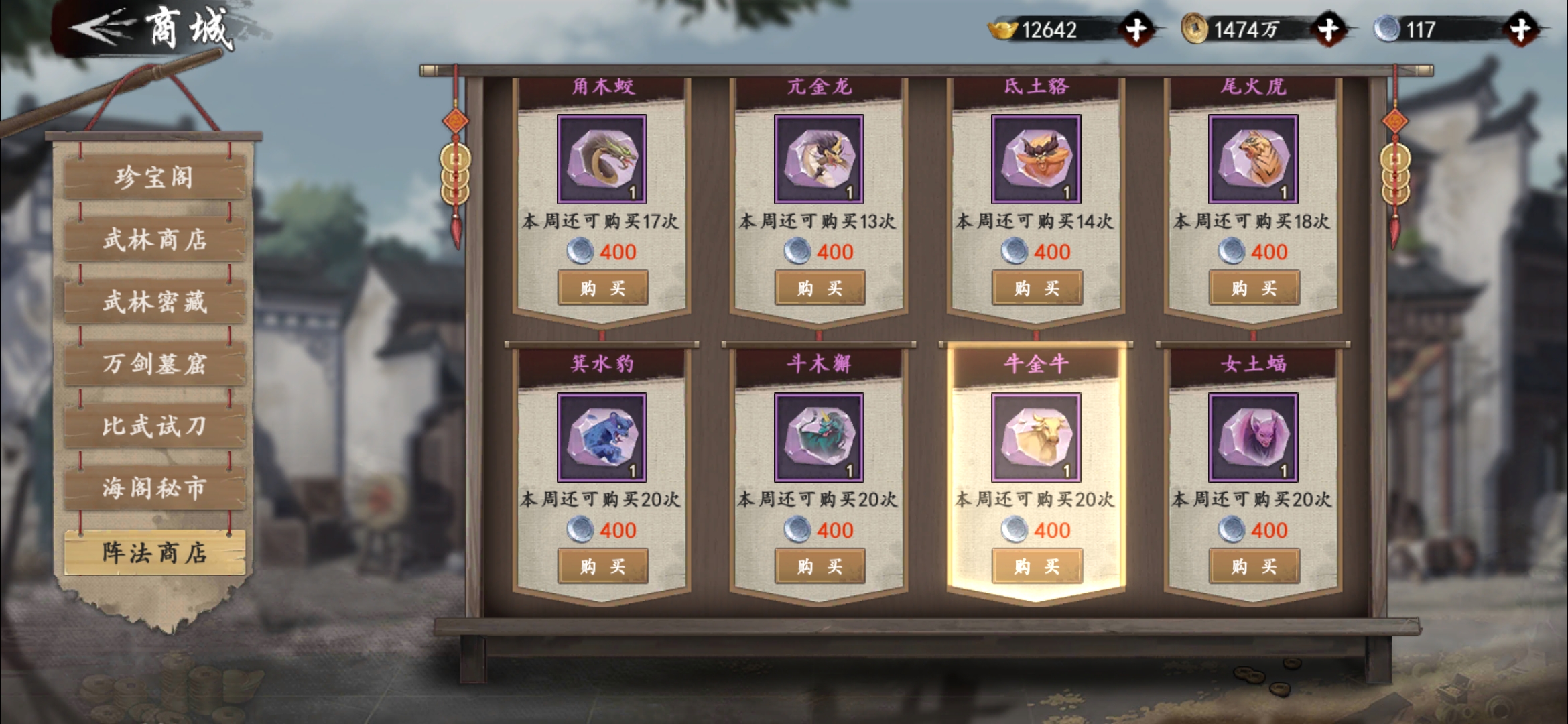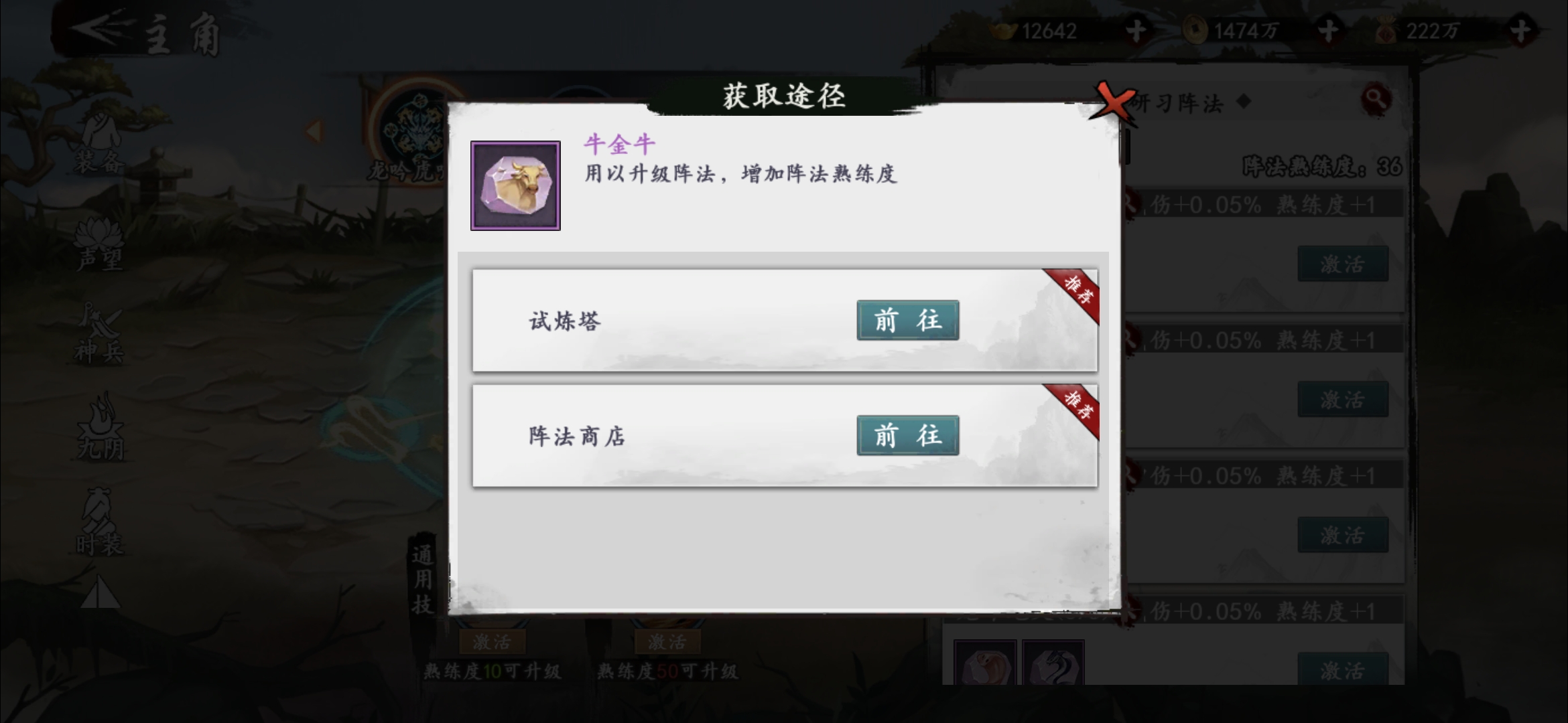 当我们通关30关后,会发现自己有大量阵法币,1.2w左右,这时候,需要我们考虑自己想用哪套阵法,由于本人阵容全为技、气,就选用第一套,虎啸龙吟阵法,我们可以在右边选择栏,选择自己优先想要的属性,如攻击,会出现对应激活所需的生肖石,这时候,只需要我们点击生肖石—获取途径—阵法商店,自己所需的生肖石会被加亮,点击购买,返回激活即可,由于前期资源有限,建议优先激活1紫生肖石1熟练度,这样累计熟练度最快。